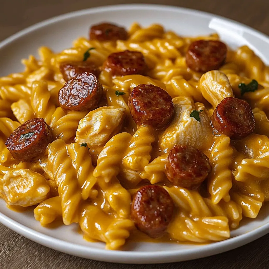 This one-pot meal mixes chicken, beef sausage, and a cheesy ranch sauce for a quick and satisfying dinner.