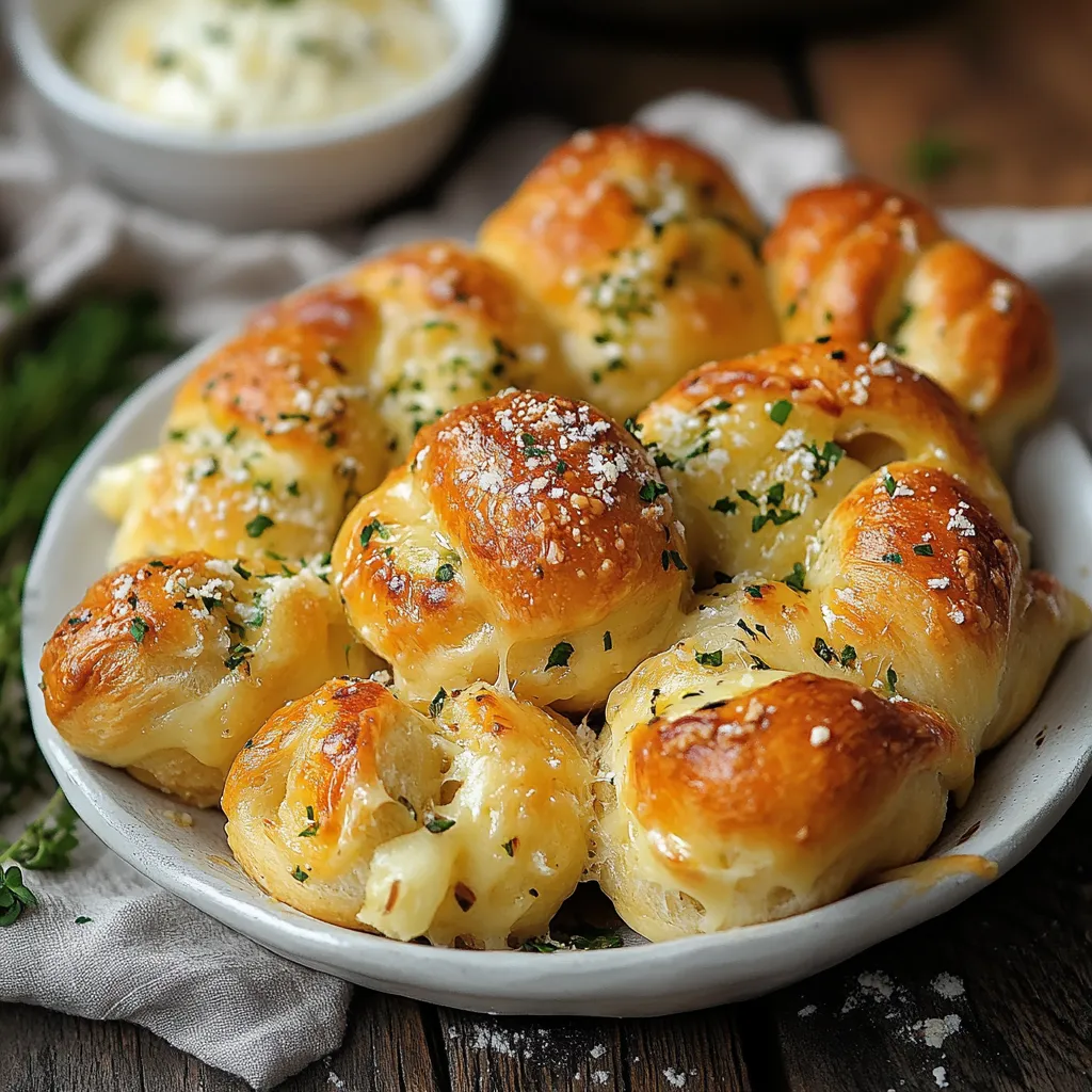 Fluffy, cloud-like bread knots stuffed with gooey cheese and slathered with fragrant garlic butter make an addictive treat that's great for any get-together. These handcrafted delights combine the warmth of just-baked bread with the joy of oozy, stretchy cheese in every mouthful.